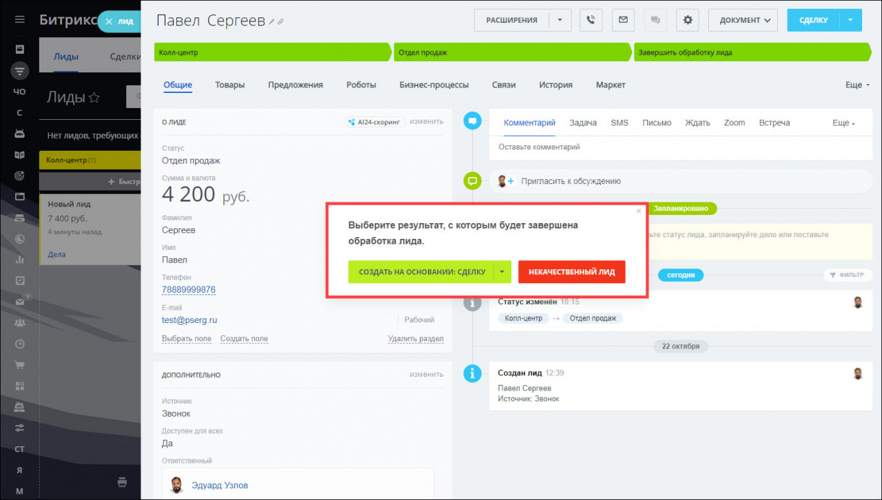 Когда клиент становится не потенциальным, а реальным, самое время сконвертировать лид в сделку.
