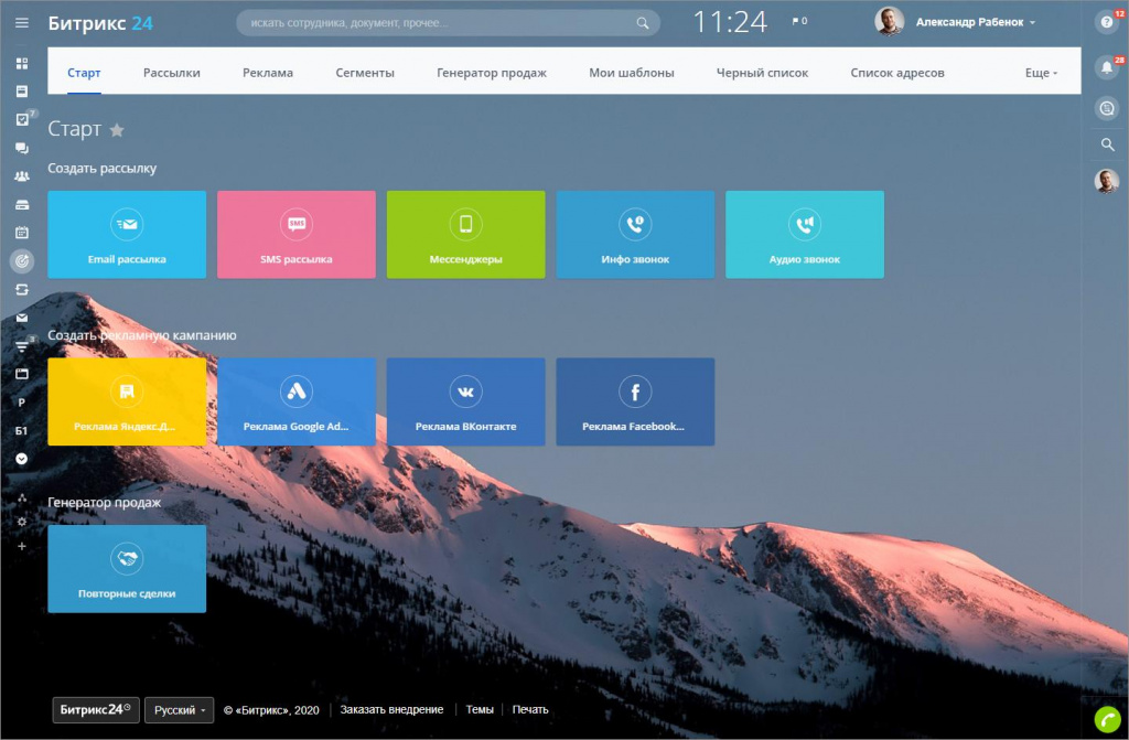 Рассылки. Можно создать e-mail или sms - рассылки, сделать рассылку в мессенджерах или запустить инфо звонок, или аудио звонок. Текст звукового сообщения вы задаете любой, его начитывает робот, встроенный в Битрикс24. Дополнительно задается голос, скорость и громкость произношения. А в случае с аудиозвонком можно добавить файл mp3.Аудитории для рекламных кабинетов. Можно запускать контекстную рекламу в Google и Яндекс, таргетированную в ВК. CRM Битрикс24 передаст список контактов рекламным системам, а все остальные действия нужно будет производить на стороне сервиса. Готовые аудитории позволят вам значительно сэкономить на привлечении клиентов и показывать рекламу, только тем кто есть в списке или похожим по поведению на ваших клиентов людям.