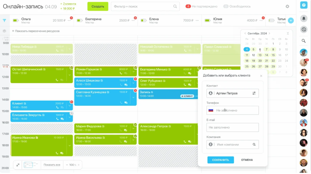 - Мультизапись: поддержка работы нескольких менеджеров, даже если они работают в разных филиалах.