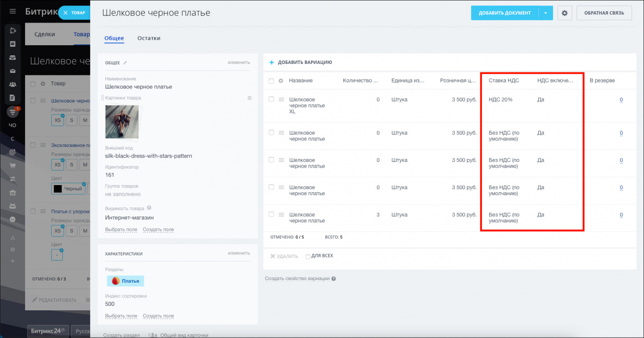 В CRM НДС на товар можно задать в карточке элемента и в карточке товара. Рассмотрим подробнее эти способы.В карточке товара налог можно установить отдельно для каждой вариации.