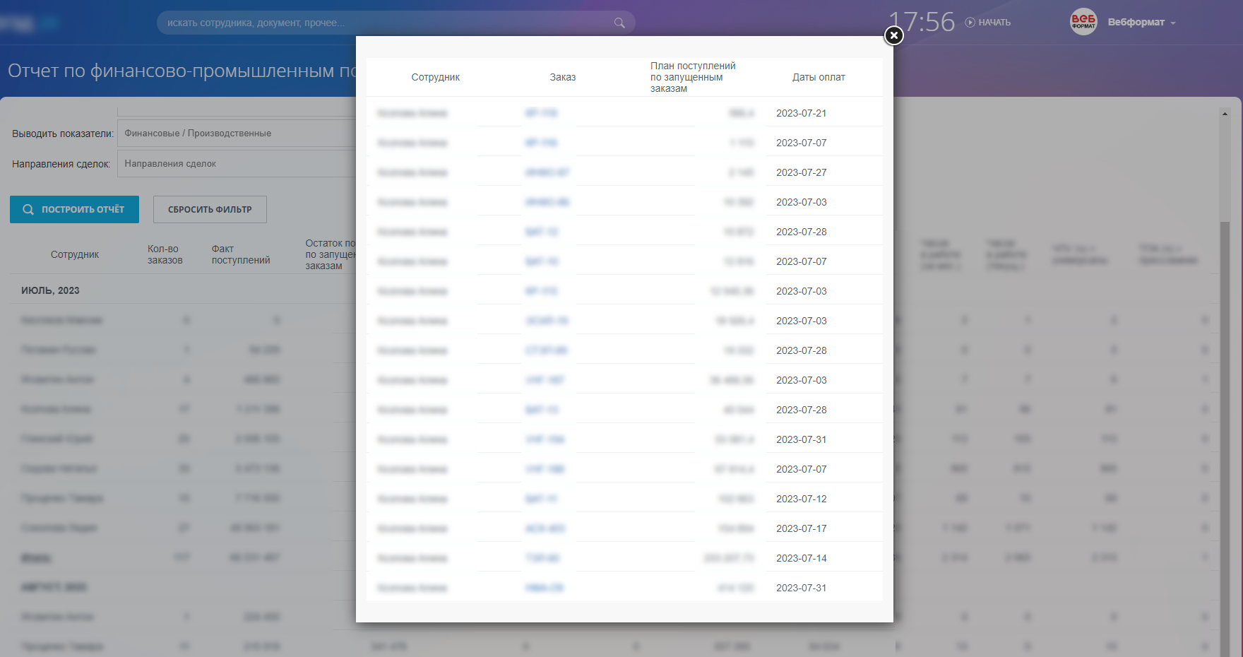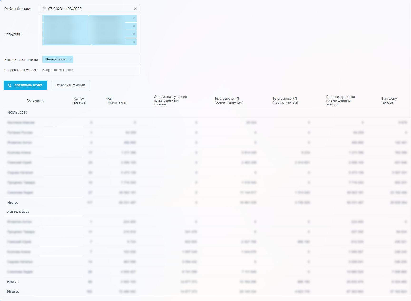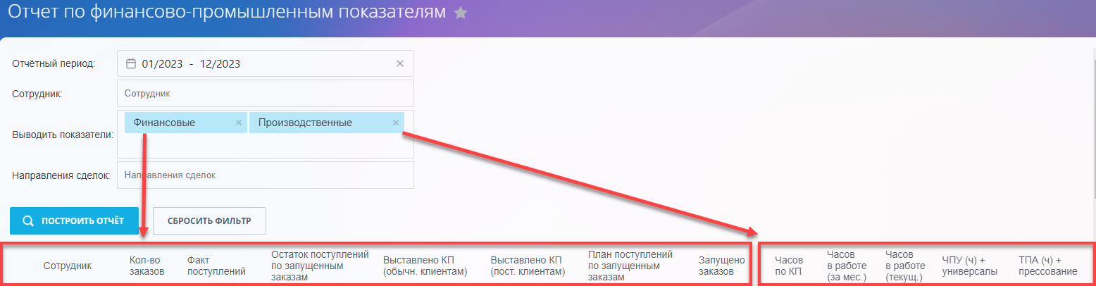 Также стоит отметить, что в фильтр отчёта добавлена возможность показывать как финансовые и производственные показатели вместе, так и по отдельности, от этого выбора зависит отображение дополнительных колонок: