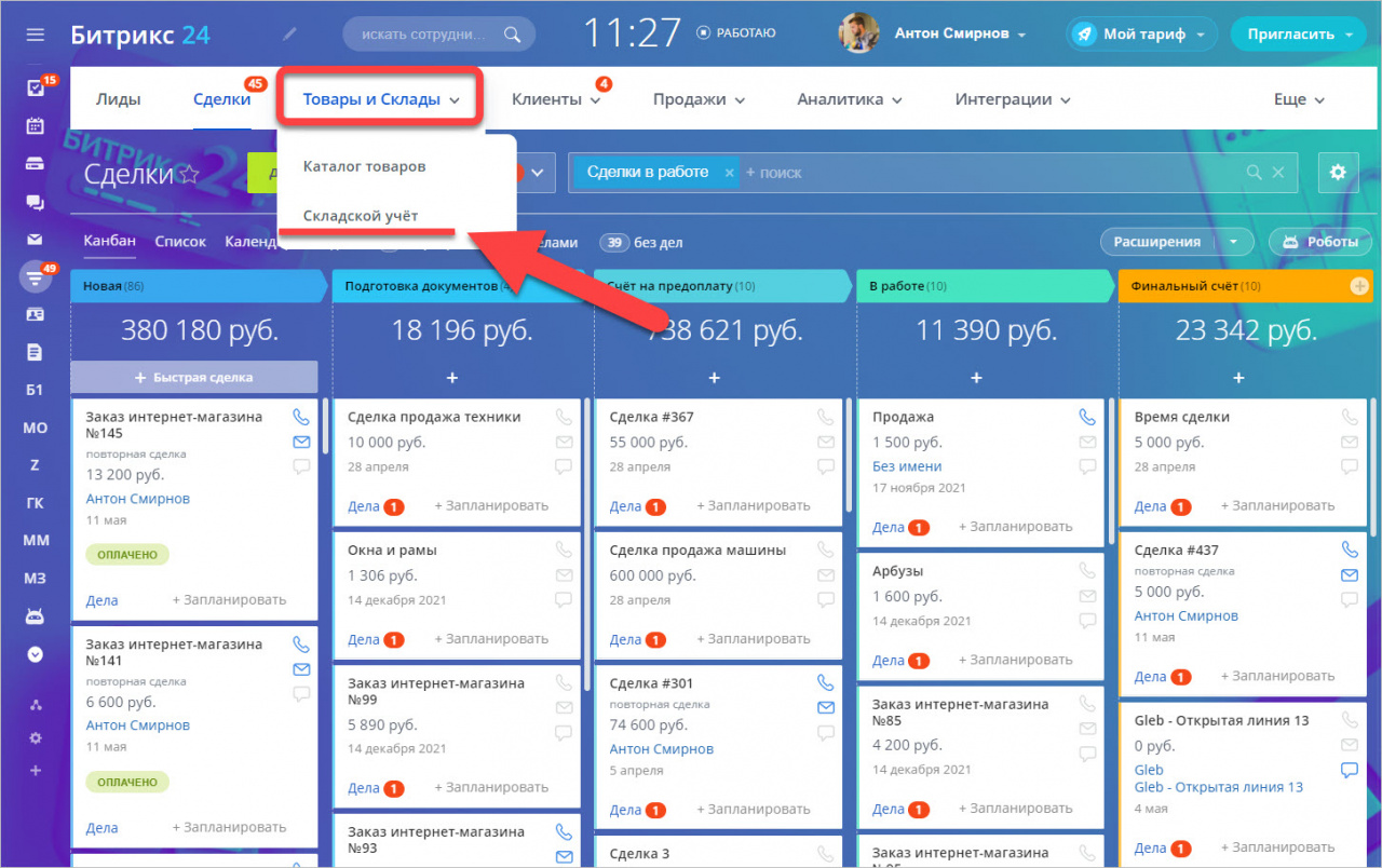 Если у вас нет товаров или вы только начали работать в Битрикс24, то подключите складской учет. Внесите товары в систему и начните управлять товаром на складах.Чтобы включить складской учет перейдите в раздел CRM или Сайты и Магазины и откройте соответствующую вкладку.