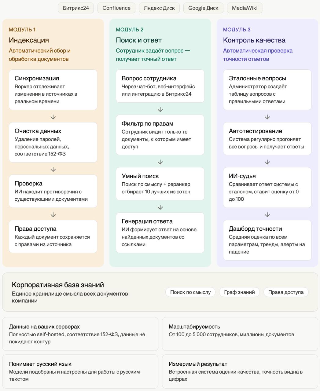 Полностью локальный вариант: если данные не должны покидать контур компании (для многих это требование законодательства), все разворачивается на собственном сервере. Единовременные затраты на железо, зато никаких ежемесячных платежей за токены и никаких вопросов по трансграничной передаче данных.