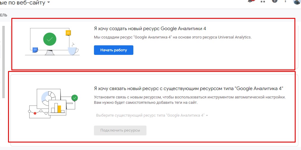 Для создания нового ресурса нажимаем на кнопку «Начало работы» под пунктом Мне нужно создать новые ресурс типа Google Аналитика 4: