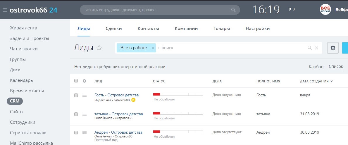 До внедрения Битрикс24 клиентская база велась в экселе, без какой-либо автоматизации: невозможно было установить напоминание о звонке, поднять историю сделок с клиентом или сформировать сегментированную рассылку. Кроме этого, трудно было дать клиенту оперативный ответ при обращении через соц. Сети, т.к. приходилось постоянно переключать вкладки, обновлять страницы и при обращении было непонятно, заносить ли такое обращение в «базу» или нет. Было решено использовать Битрикс24 из-за набора возможных для использования инструментов. Помимо блока CRM, клиенту также была важна синхронизация календарей и интеграция с соц. Сетями и сайтом. Компания Вебформат была выбрана по рекомендации.Процесс внедрения Битрикс24