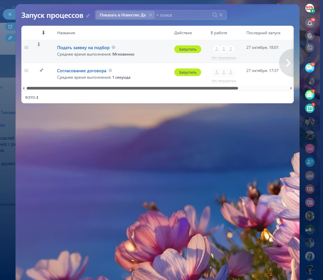Для упрощения старта процесса была создана интерактивная форма «Подача заявки на согласование договора», доступная прямо из ленты новостей Bitrix24.