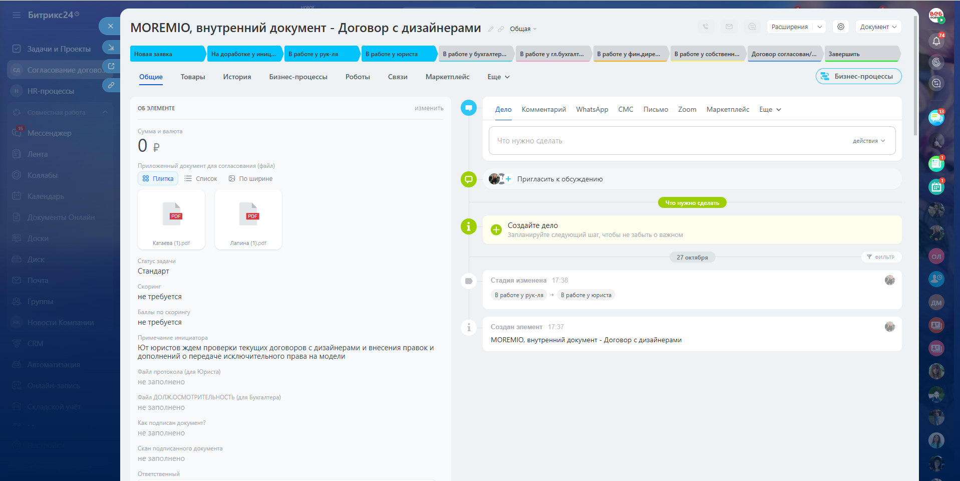 • Таймлайн — отображает все действия и переходы карточки между стадиями, формируя прозрачную историю согласования.