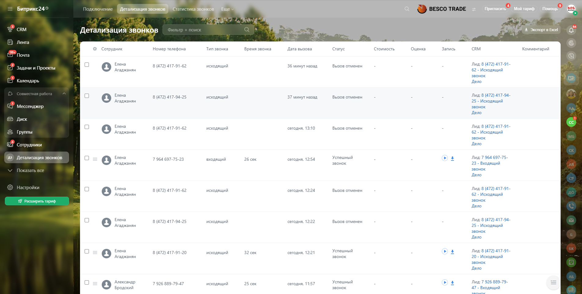 • интегрировали АТС Билайн, чтобы все звонки автоматически попадали в CRM, включая записи разговоров;