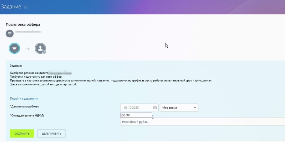 При переносе карточки на стадию «Подготовка оффера», система запрашивает сумму заработной платы и дату выхода.