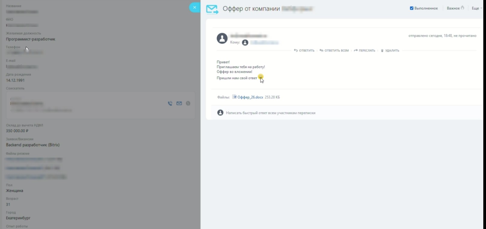 При назначении собеседования, система запрашивает данные: дату, время и формат мероприятия, а далее автоматически высылает кандидату письмо с этими данными, а также создает в календаре встречу с актуальным описанием и вложенным файлом резюме.