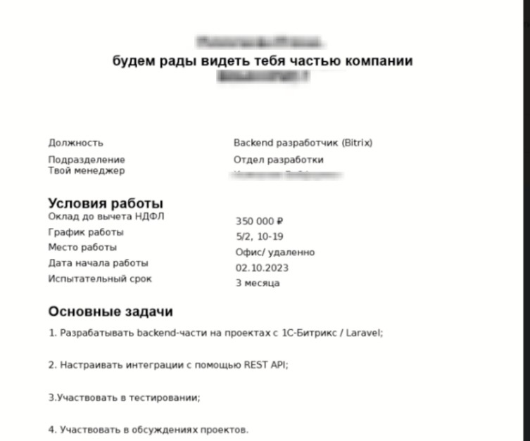 Все данные система берет из вакансии, указывает в оффере, при этом используя фирменный шаблон заказчика.