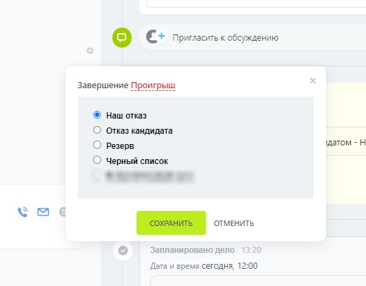 Если кандидат отказался, выбираем варианты негативного сценария развития событий и система обязательно попросит указать комментарий для дальнейшего анализа данных.