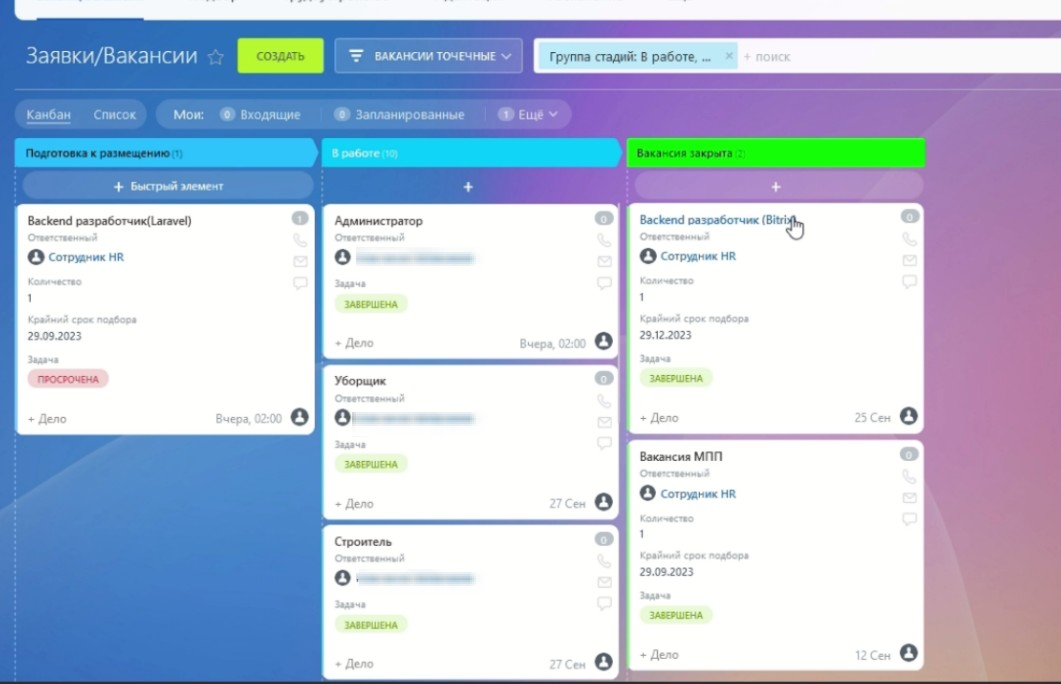 А в случае положительного решения кандидата, вакансия переходит на этап «вакансия закрыта»
