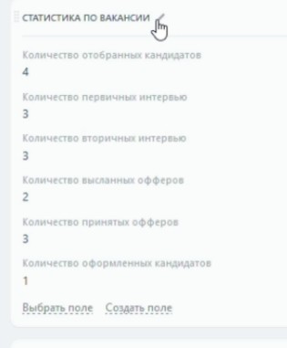 Каждая вакансия умеет собирать аналитику воронки подбора и хранит эти данные в карточке вакансии.