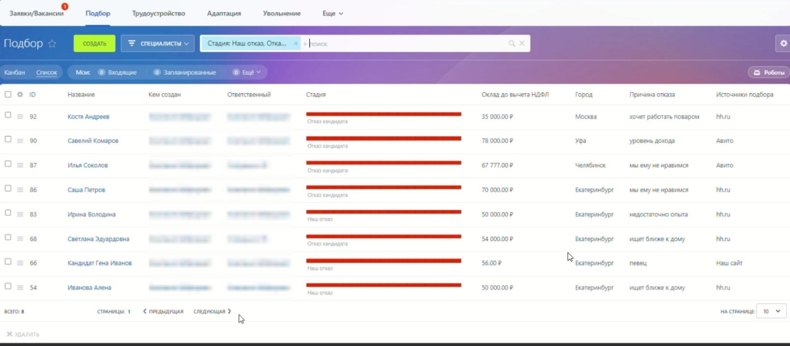 И, конечно, можем работать с кандидатами из кадрового резерва, переводя их на любой этап воронки подбора