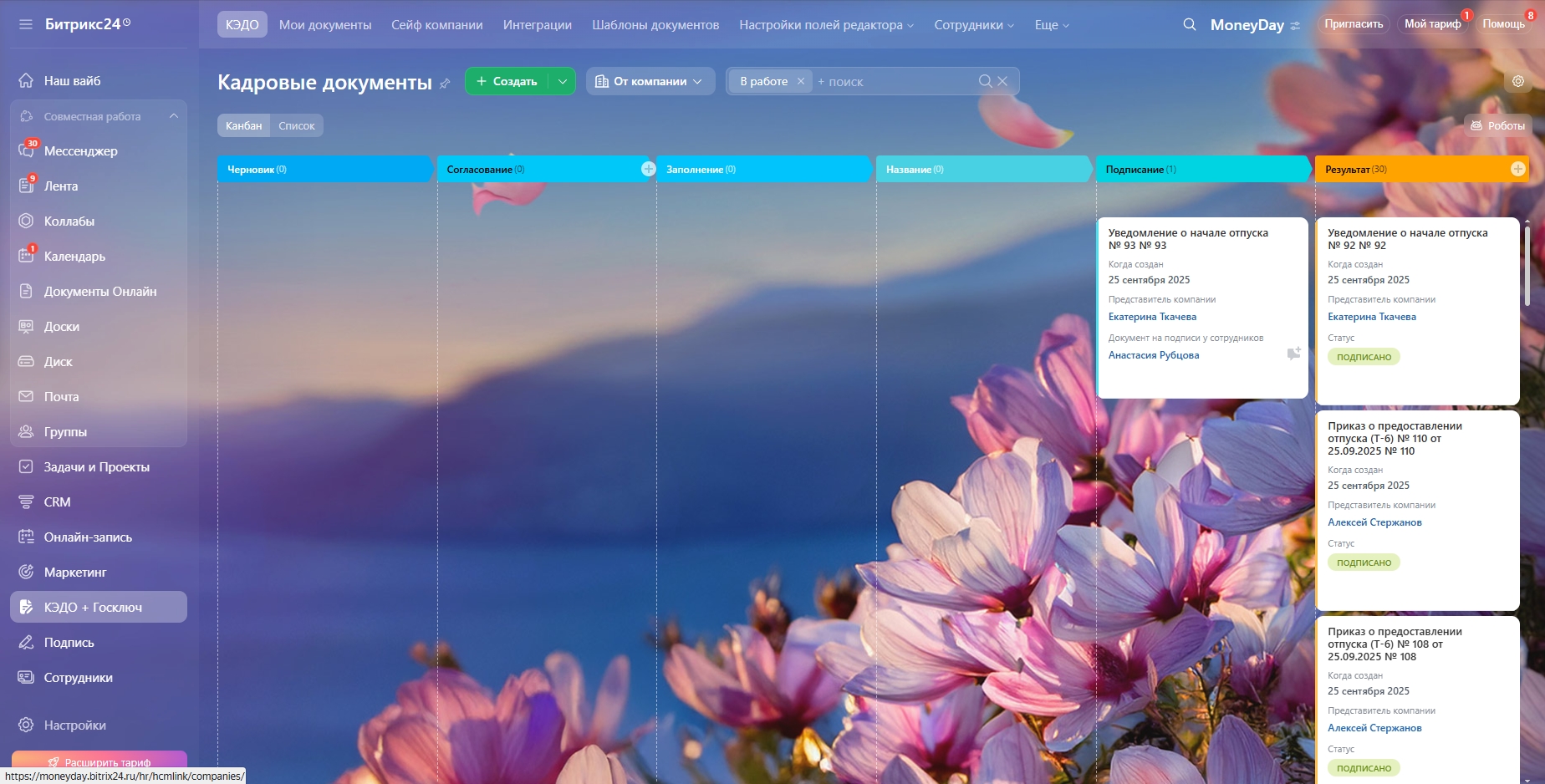 • Настроили канбан-доску в Битрикс24 со статусами: «Черновик → Отправлено сотруднику → Подписано сотрудником → На подписи у компании → Завершено/Отклонено». Подключили уведомления в чат/почту и SLA-контроль сроков.