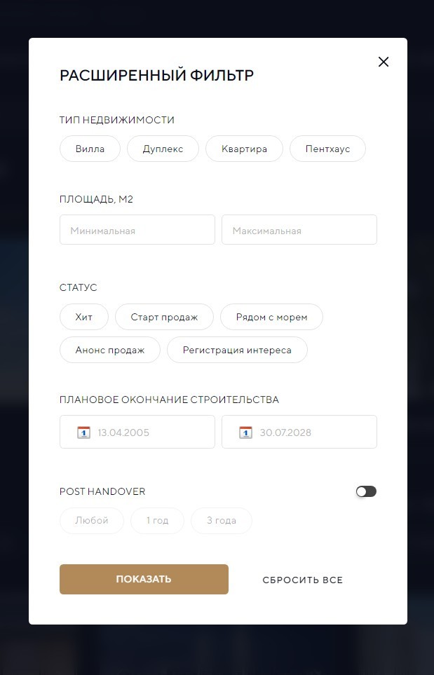 Создать эффективный веб-сайт, который улучшит пользовательский опыт клиентов Palmis Capital и увеличит конверсию. Реализовать сложные фильтры для поиска и параметров подбора недвижимости.Решение