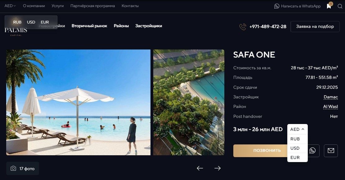 Сайт Palmis Capital был успешно разработан и запущен. Функциональный фильтр позволяет клиентам Palmis Capital быстро находить и подбирать недвижимость в Дубае в соответствии с их требованиями и предпочтениями. А визуал демонстрирует принадлежность к премиум-сегменту и статусность компании.