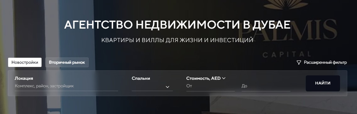 Задача: Разработать современный и функциональный веб-сайт для Palmis Capital, ведущей компании в сфере недвижимости в Дубае, с уникальным фильтром для удобного поиска и подбора недвижимости, и при этом запуститься в очень сжатые сроки - полтора месяца.