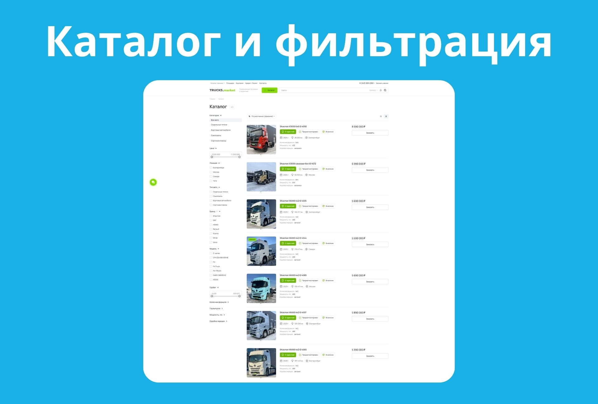 - фильтрация по типу техники, марке, модели, году выпуска, цене и пробегу;