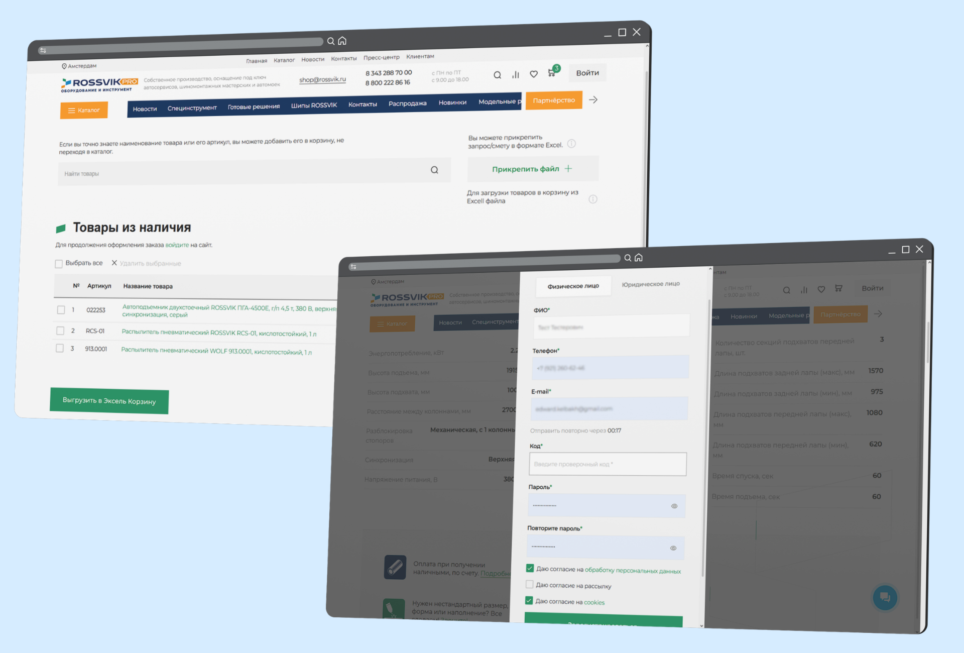 Личный кабинет тоже проектировался не как формальный раздел «профиль», а как рабочее пространство клиента. В нем уже описаны и частично реализованы профиль пользователя, блок контрагентов, адреса доставки, история заказов, привязка счетов и менеджеров, а также сценарии сервисного центра. Отдельно реализована форма регистрации оборудования, данные из которой сохраняются на сайте и маркируются для выгрузки в 1С.