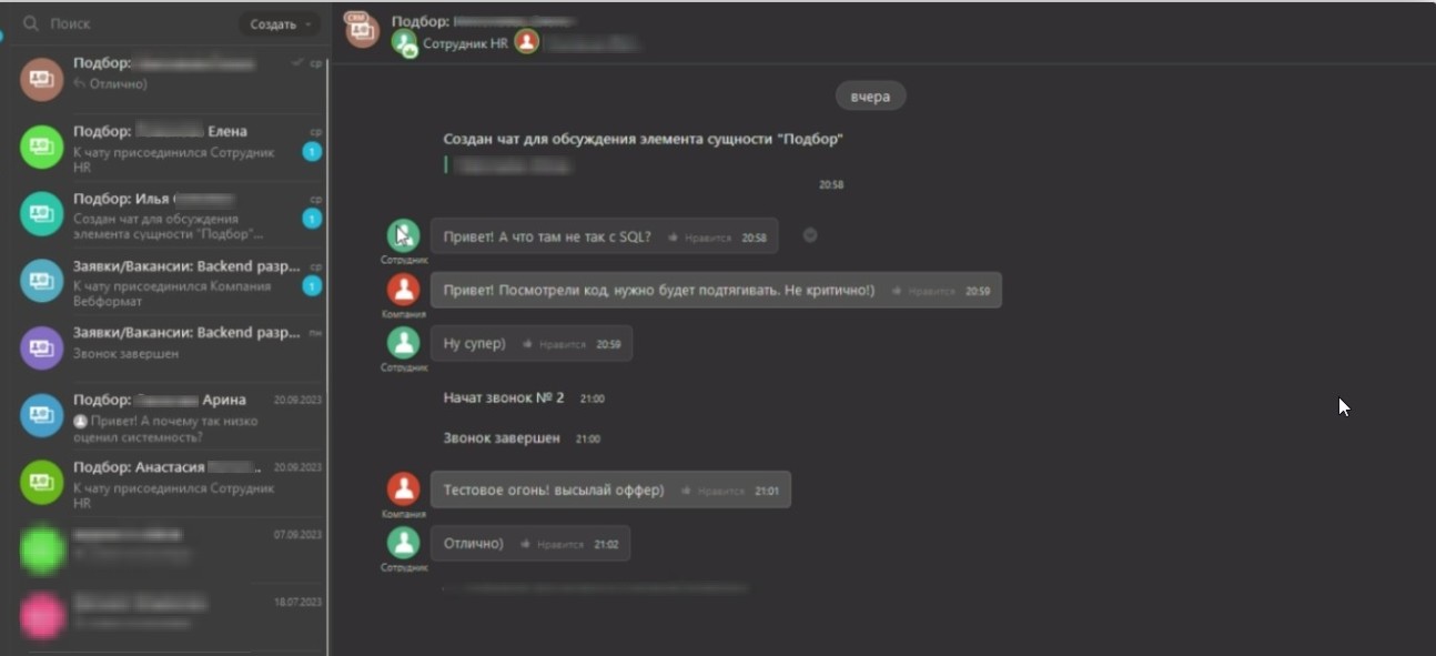 Из карточки кандидата можем создать чат одним кликом. Он будет иметь название с именем кандидата, а участниками будут представители заказчика. Плюс этой возможности в том, что вы точно не потеряете обсуждение кандидата в личных чатах.