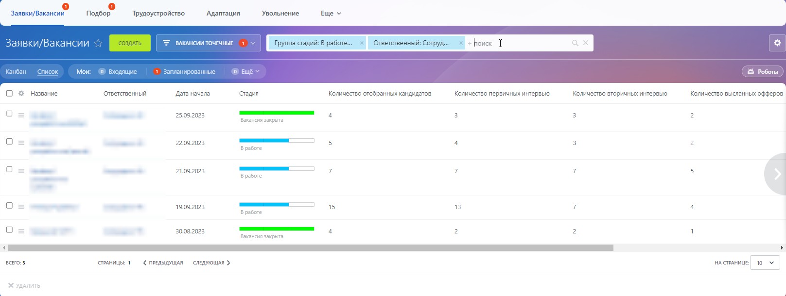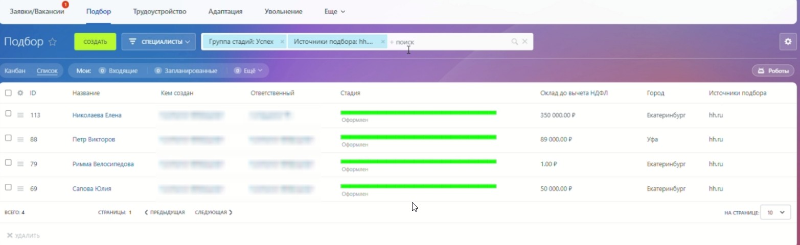В системе мы реализовали все этапы подбора, которые имеются в компании.