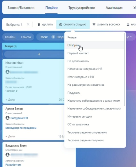 И, конечно, можем работать с кандидатами из кадрового резерва, переводя их на любой этап воронки подбора